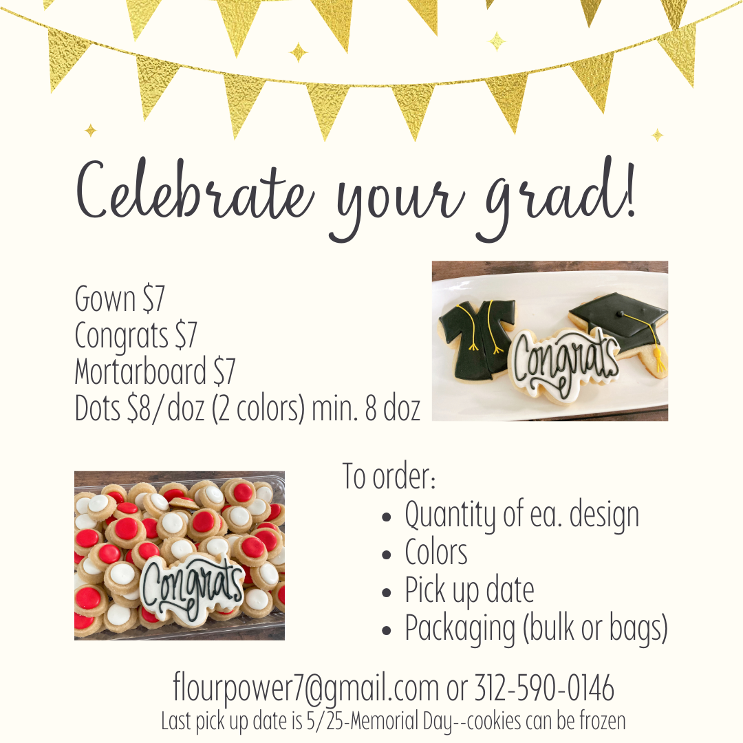 ADDING LARGE COOKIES TO A PLATTER OF DOTS: Choose from Grad Robe, Grad Hat, or “Congrats”. Each is $7. Or if you need just a few wrapped large cookies you can order them directly on my site each week.