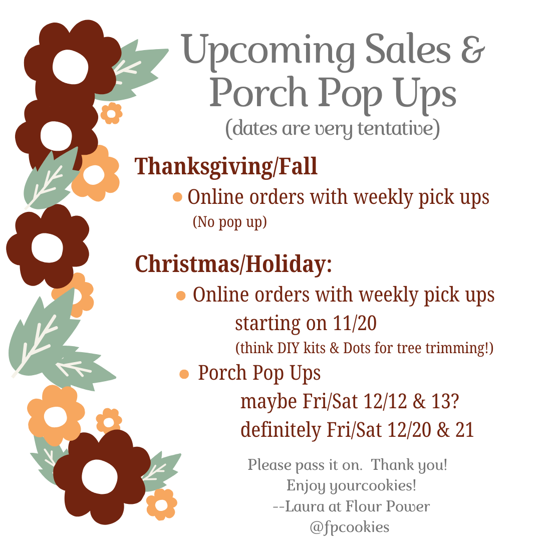 I have lots of seasonal cookies ready now for ordering online with weekly pick ups at this link. (Contact me if you need them earlier than Friday.)